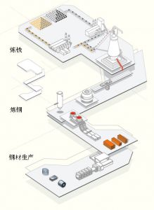 煉鋼法:原料--可以是鐵礦石也可以是廢鐵,這取決于工藝過程--首先熔化成鋼水。以礦砂為原料的煉鋼須使用高爐,而以廢鐵為原料的工藝使用的是電弧熔爐。