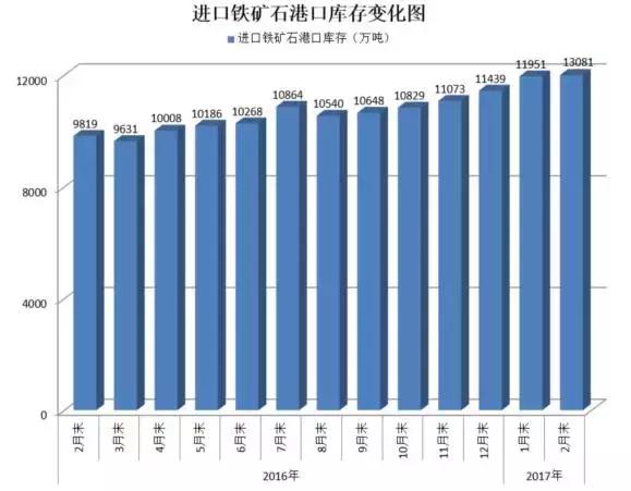 事實上,從2016年11月份以來,港口鐵礦石庫存量一直保持在1.1億噸以上的高位,2月份港口庫存量激增9%,突破1.3億噸。