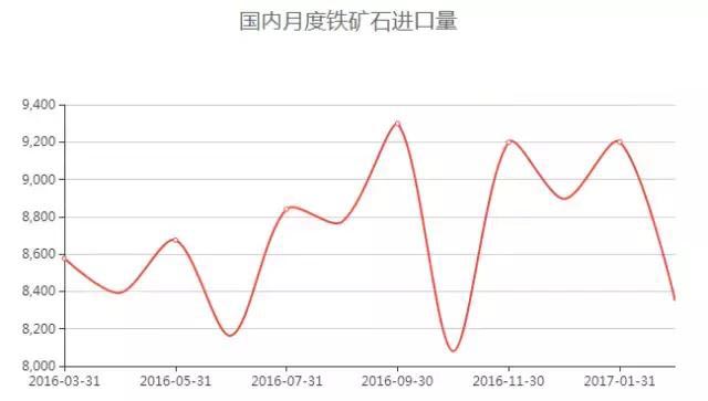 根據(jù)海關(guān)統(tǒng)計,2017年2月我國鐵礦石進口量為8349萬噸,同比增加13.42%,環(huán)比下降9.25%。