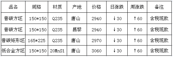 矩形方坯現(xiàn)金含稅價為2970元/噸,低合金方坯20Mnsi現(xiàn)金含稅價3060元/噸。