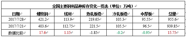 縱觀全國市場,本期全國35個主要市場螺紋鋼庫存量為421.2萬噸,增加17.6萬噸,增幅為4.36%;線材庫存量為113.9萬噸,增加1.15萬噸,增幅為1.02%。而從全國線材、螺紋鋼、熱軋板卷、冷軋板卷、中厚板五大品種庫存總量來看,本期全國綜合庫存總量為955.6萬噸,較前一周增加15.75萬噸,增幅為1.68%?傮w來看,全國鋼材市場庫存連續(xù)第二周上升,且升幅較上周有所擴(kuò)大,目前的庫存水平較去年同期增加63.2萬噸,增幅7.08%。隨著鋼價上漲至高位,下游用戶及中間商開始出現(xiàn)一定的恐高心理,成交繼續(xù)趨弱,庫存繼續(xù)累積。