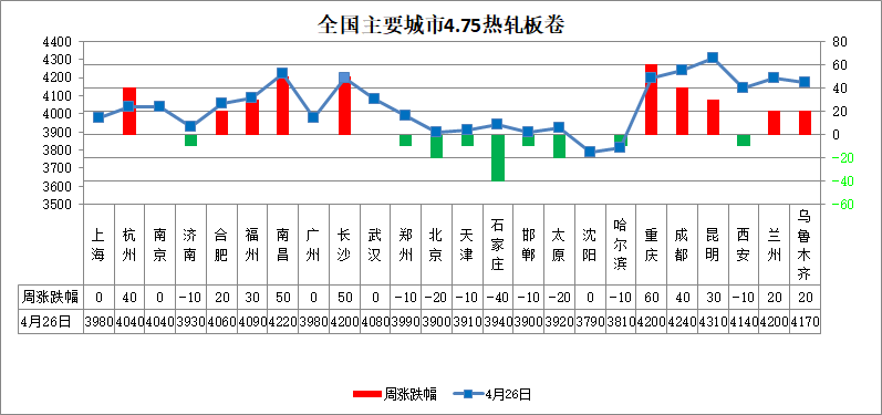 熱軋板卷:本周全國熱軋板卷市場價格上漲為主。全國24個熱軋4.75mm市場均價4043元/噸,較上周上漲9元/噸。