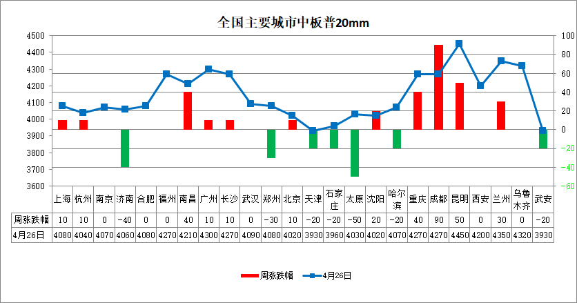 中板:本周中厚板市場價格上漲為主。全國24個主要市場20mm普中板平均價格為4140元/噸,較上周上漲5元/噸。