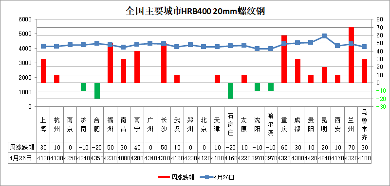 建筑鋼材:本周建筑鋼材市場價格上漲為主。全國25個市場螺紋HRB400(20mm)均價為4231元/噸,較上周上漲16元/噸。