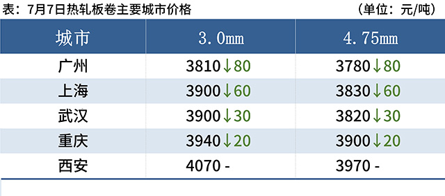 熱軋板卷:7月7日,全國24個(gè)主要城市4.75mm熱軋板卷均價(jià)3892元/噸,較上個(gè)交易日下跌25元/噸。隨著午后盤面跳水的刺激,現(xiàn)貨價(jià)格跟跌,但幅度較小,市場觀望情緒較強(qiáng)。本周表需下滑,市場小幅累庫,基本面無明顯變化,但由于周五期貨尾盤跳水,市場觀望情緒增加,且進(jìn)入7月傳統(tǒng)消費(fèi)淡季,需求端難有顯著轉(zhuǎn)好跡象。后期仍需關(guān)注終端需求量以及政策面等相關(guān)消息。預(yù)計(jì)下周全國熱軋板卷價(jià)格或?qū)⒄鹗幤踹\(yùn)行。