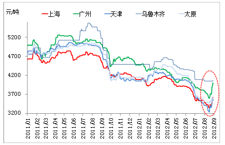 除了不同鋼材品種間存在差異之外,本輪反彈也表現(xiàn)出一定的區(qū)域性特征。圖2對比了不同城市間螺紋鋼價格走勢的差異,可以發(fā)現(xiàn)廣州、天津等市場價格變化較大,而烏魯木齊、太原等市場表現(xiàn)則相對平穩(wěn)。從數(shù)據來看,自9月10日左右螺紋鋼啟動上漲至今,廣州上漲幅度最大,達到了400元/噸;天津次之,漲幅也達到了350元/噸;太原、烏魯木齊漲幅相對較小,僅分別上漲70元/噸和20元/噸。將漲幅最大的廣州和漲幅最小的烏魯木齊進行對比,兩個城市上漲的幅度差距高達380元/噸。