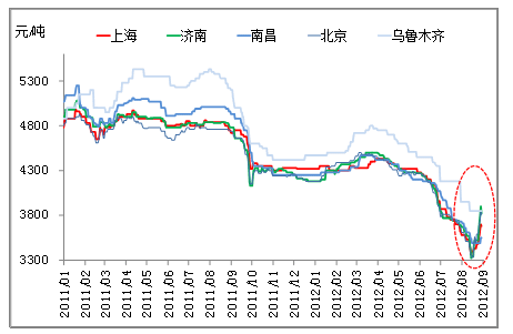 價格差異較大與各城市間本來的價格水平也不無關系,烏魯木齊由于地理位置較為偏遠,運輸不便,市場相對較為封閉,大多數(shù)時間,當?shù)氐膬r格水平相對較高,因此,在其他市場普遍上漲的情況下,它的價格依然處于高位,上漲動力不足。而上漲幅度較大的濟南、廣州、北京等市場大多價格水平本來不高,而且前期出現(xiàn)了較大的跌幅,鋼聯(lián)云終端因此存在補漲的需要。