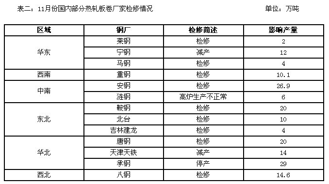 據(jù)調(diào)查的38家生產(chǎn)企業(yè)的64條熱軋線生產(chǎn)線來看,正常月產(chǎn)能為1636.26萬噸,9月份計劃產(chǎn)量1277.12萬噸,達產(chǎn)率78.1%,環(huán)比減少3.9%,因檢修影響的產(chǎn)量為184.46萬噸。而到11月份,64條產(chǎn)線中14條產(chǎn)線檢修或減產(chǎn),影響產(chǎn)量172.6萬噸,戰(zhàn)總產(chǎn)量的10.3%。