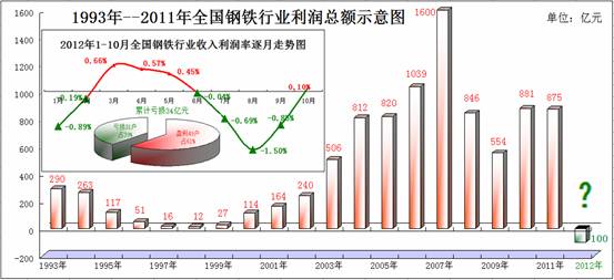 據(jù)最新數(shù)據(jù)顯示,中國(guó)鋼鐵行業(yè)在今年的前10個(gè)月中,經(jīng)營(yíng)虧損月份達(dá)到了6個(gè)月,剛好占60%,僅3、4、5、10月有1%不到的微利,累計(jì)虧損34億元。這表明,投資收益已經(jīng)難掩鋼鐵行業(yè)實(shí)際虧損的困境。(見下圖)