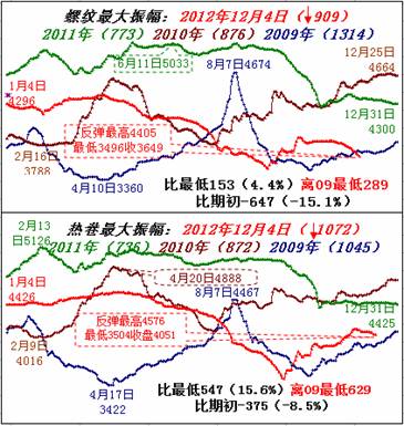 從近期鋼材現(xiàn)貨價(jià)格走勢(shì)看,全國(guó)鋼材價(jià)格自9月中旬起的大幅反彈,到11月中旬的重拾跌勢(shì)(見上圖),預(yù)測(cè)11月份行業(yè)或?qū)⒅叵萏潛p境地,12月份鋼價(jià)在前期的低價(jià)位上,難言反轉(zhuǎn)。因此可以斷言,今年全國(guó)鋼鐵業(yè)現(xiàn)歷史性虧損已成定局。