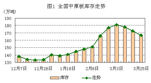 庫存方面,中板社會庫存總量率先下降并連續(xù)走低。中鋼協(xié)發(fā)布的最新數(shù)據(jù)顯示,2013年3月上旬全國粗鋼日均產(chǎn)量預(yù)估值為208.46萬噸,旬環(huán)比增長2.48%,再創(chuàng)歷史新高。從產(chǎn)量數(shù)據(jù)來看,目前鋼材市場情況仍面臨高庫存、高產(chǎn)量、低需求的尷尬境地,但值得欣慰的是,據(jù)中板小組調(diào)查顯示,雖然3月份國內(nèi)中厚板產(chǎn)線達(dá)產(chǎn)率較2月份有所提高,但產(chǎn)量供應(yīng)增加量并不是很多。從近幾周國內(nèi)中厚板社會庫存連續(xù)下降可以印證(圖1所示)。另外,從本周市場來看,全國中板均價(jià)小幅回漲,其中原因除了受遠(yuǎn)期走強(qiáng)帶動(dòng)外,新資源到貨偏少、規(guī)格短缺現(xiàn)象出現(xiàn)、庫存量持續(xù)回落等也是價(jià)格堅(jiān)挺的關(guān)鍵因素。由此分析,中板小組認(rèn)為,后期低庫存對市價(jià)有一定支持作用。