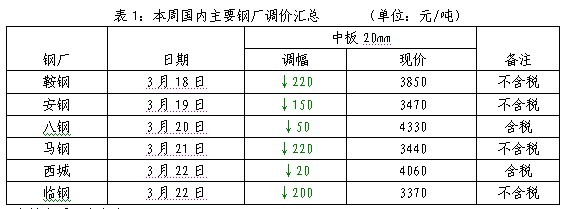 鋼廠方面,生產(chǎn)成本下降驅(qū)動(dòng)其下調(diào)出廠價(jià)。雖然低庫存和下游需求釋放在四月份對價(jià)格將形成有利支持,但因原料價(jià)趨弱牽制成本上行,且近期中厚板生產(chǎn)企業(yè)產(chǎn)量增加之后,一些廠家接單情況不佳,為了吸引訂單,鋼廠降低出廠價(jià)格的舉動(dòng)也時(shí)有發(fā)生。從表1數(shù)據(jù)可以看出,鋼廠最近出廠價(jià)的下調(diào)幅度有所加大,這也表明后期將仍有一部分低價(jià)資源抵達(dá)市場,屆時(shí)貿(mào)易商套現(xiàn)獲利行為或抑制價(jià)格上行速度。