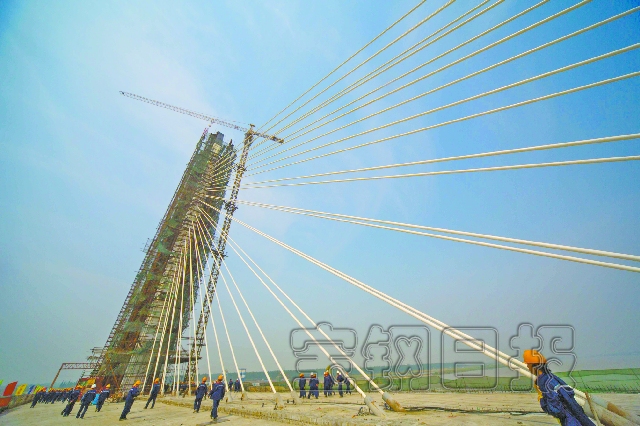 如皋長江大橋于2010年8月開工建設(shè),投資5.6億元,采用雙塔斜拉橋設(shè)計?⒐ねㄜ嚭螅绺揲L江大橋?qū)⑦B接蘇南沿江高速公路,通達蘇南各大城市,成為如皋乃至蘇北地區(qū)承南啟北的重要交通干線。圖為如皋長江大橋建設(shè)者從85米高的主塔及斜拉索前走過。