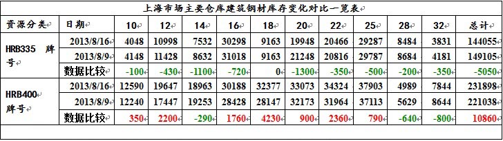 西本新干線現(xiàn)貨交易平臺監(jiān)測的數(shù)據(jù)顯示,2013年8月16日,上海市場主要倉庫HRB335牌號10-32mm螺紋鋼庫存總量為144405噸,同口徑統(tǒng)計范圍數(shù)據(jù)較8月9日減倉5050噸,減倉幅度3.39%;同期,主要倉庫HRB400牌號10-32mm螺紋鋼庫存總量為231898噸,同口徑統(tǒng)計范圍數(shù)據(jù)較8月9日增倉10860噸,增倉幅度4.91%。綜合數(shù)據(jù),本期滬上螺紋鋼總體增倉5810噸,增倉幅度為1.57%。